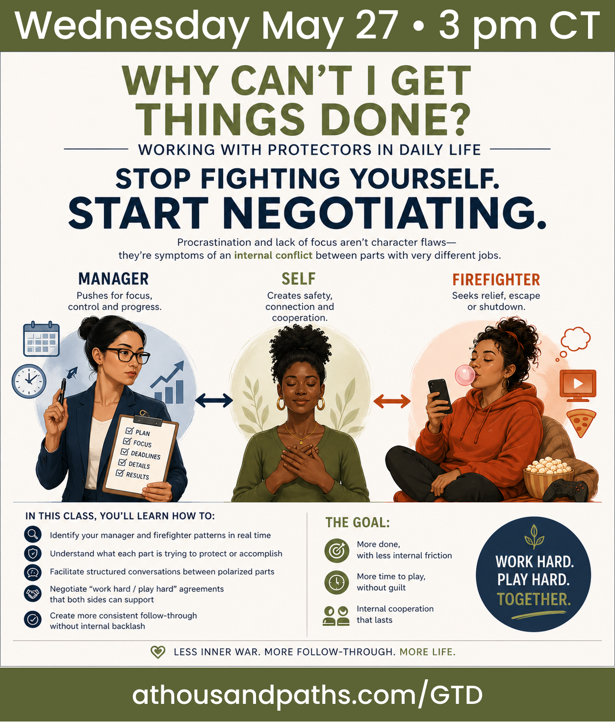 This class explores a common internal dynamic: the polarization between manager parts that want focus, discipline, and progress, and firefighter parts that seek relief, play, or shutdown.